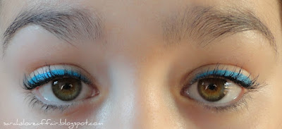 All done! Guys, I LOVE this eyeliner! Well, maybe not specifically the product, but this color! Oh. my. gosh. I got so many compliments on this! I typically don't go for blue liner, or eye products in general, but this look may have converted me... Seriously. I love in the last picture how you can see my lashes, and then just sort of peeking out from behind is a really super bright blue! I'm sure you could use any bright blue color for this look, this was just the one I had on hand. It's from the brand "Townley Cosmetics". I'm pretty sure they make cosmetics for kids, so basically play cosmetics. But hey, whatever! I love this color!