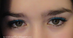 All done! Guys, I LOVE this eyeliner! Well, maybe not specifically the product, but this color! Oh. my. gosh. I got so many compliments on this! I typically don't go for blue liner, or eye products in general, but this look may have converted me... Seriously. I love in the last picture how you can see my lashes, and then just sort of peeking out from behind is a really super bright blue! I'm sure you could use any bright blue color for this look, this was just the one I had on hand. It's from the brand "Townley Cosmetics". I'm pretty sure they make cosmetics for kids, so basically play cosmetics. But hey, whatever! I love this color!